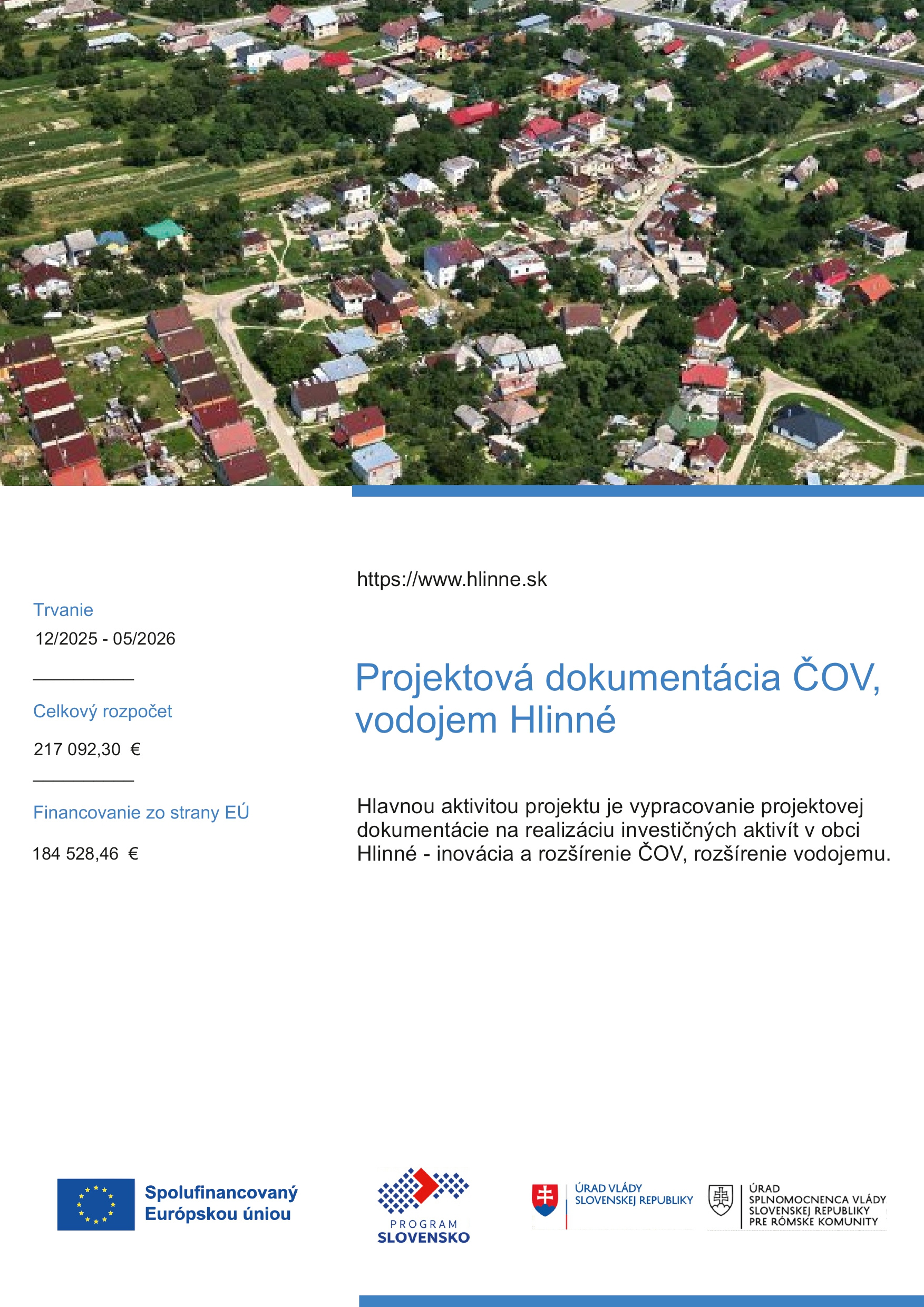 Obec Hlinné pripravuje významný infraštruktúrny projekt zameraný na zlepšenie nakladania s vodou a odpadovými vodami. V období od decembra 2025 do mája 2026 bude vypracovaná projektová dokumentácia na modernizáciu a rozšírenie čistiarne odpadových vôd (ČOV) a rozšírenie kapacity vodojemu.