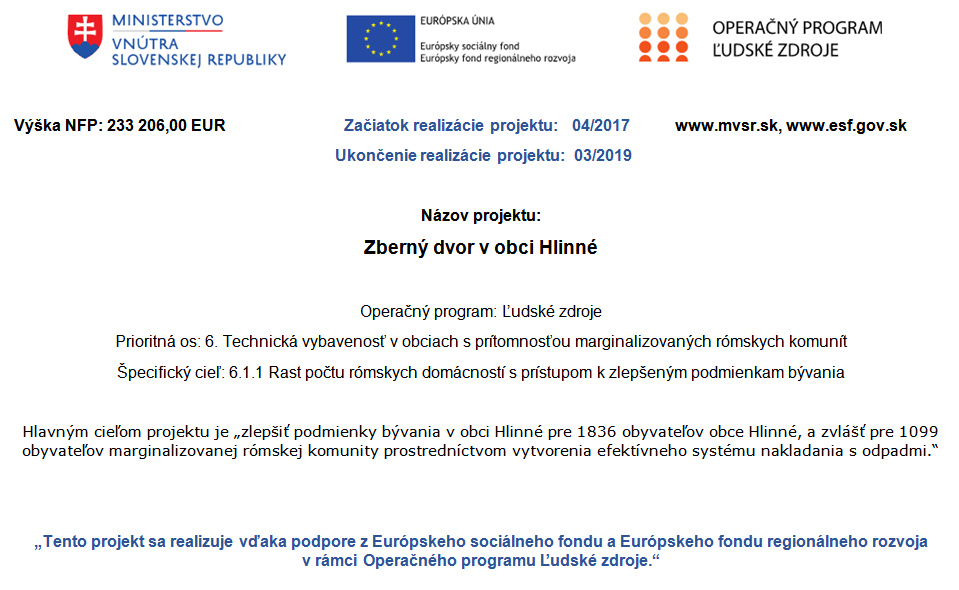 Stavba zberného dvora má v oblasti triedeného zberu komunálneho odpadu pre obec Hlinné zabezpečiť vybudovanie zberného dvora- priestoru, kde môžu občania odovzdávať oddelené zložky komunálnych odpadov vrámci triedeného zberu.