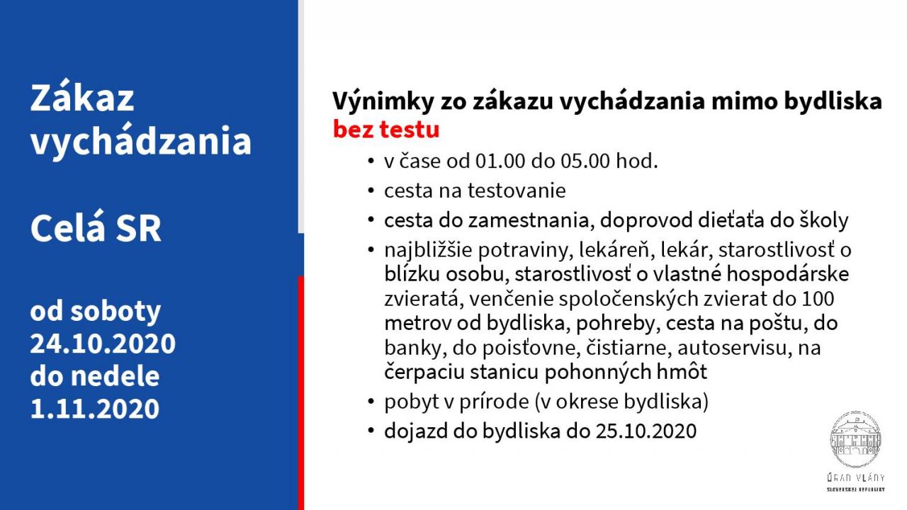ZÁKAZ VYCHÁDZANIA: CELÁ SR od soboty 24. októbra 2020 do nedele 1. novembra 2020