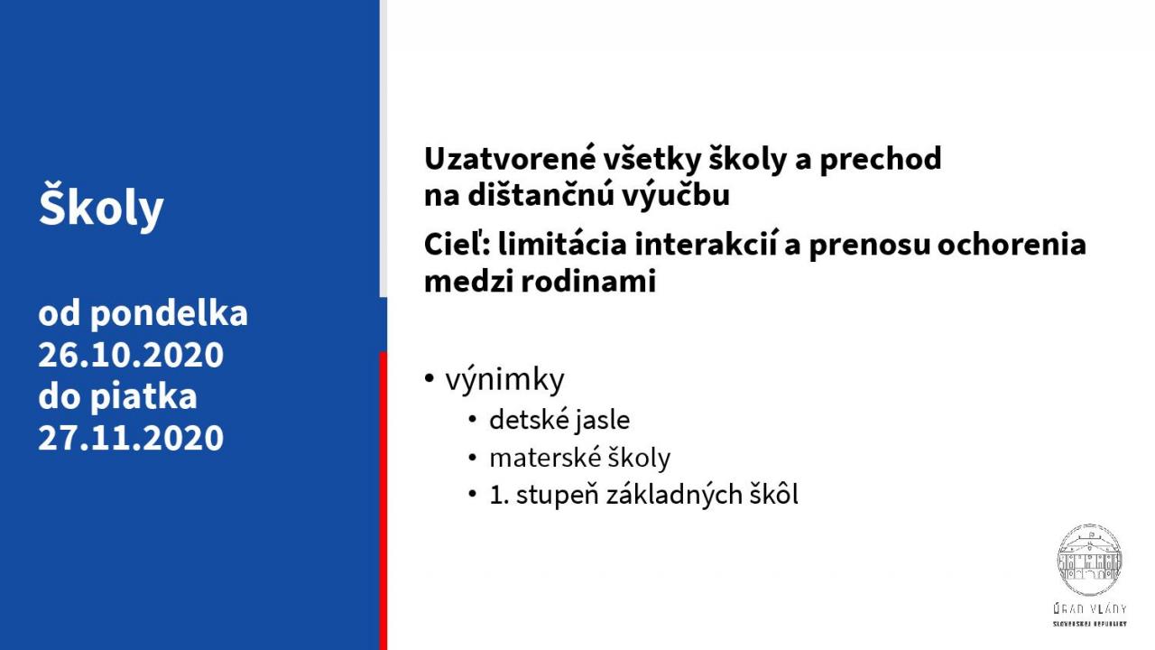 Školy od pondelka 26. októbra 2020 do piatka 27. novembra 2020: