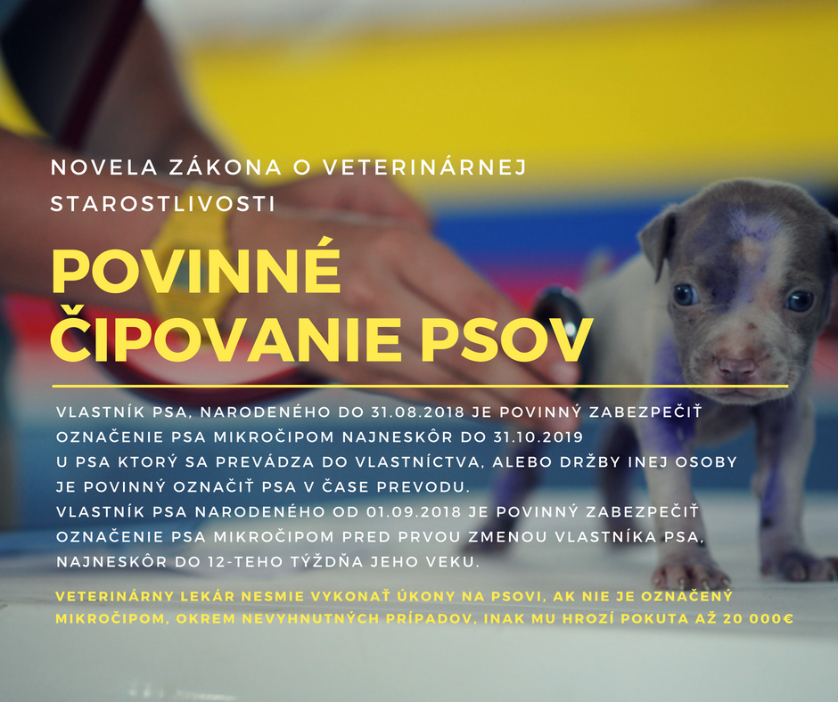 Podľa novely zákona č. 39/2007 Z. z. o veterinárnej starostlivosti v znení neskorších predpisov od 1. 9.2018 pre vlastníkov psov pribúda povinnosť označiť na vlastné náklady implantovateľným transpondérom (mikročipom ISO norma 11785). Na splnenie tejto povinnosti je určené prechodné obdobie do 31.10.2019, ale len pre tých chovateľov, ktorým sa pes narodil pred 1. septembrom 2018. Psi narodení po 1.9.2018 musia byť označení do 12 týždňov veku alebo pred zmenou vlastníka. Na psov narodených po 1.9.2018 sa prechodné obdobie nevzťahuje.
